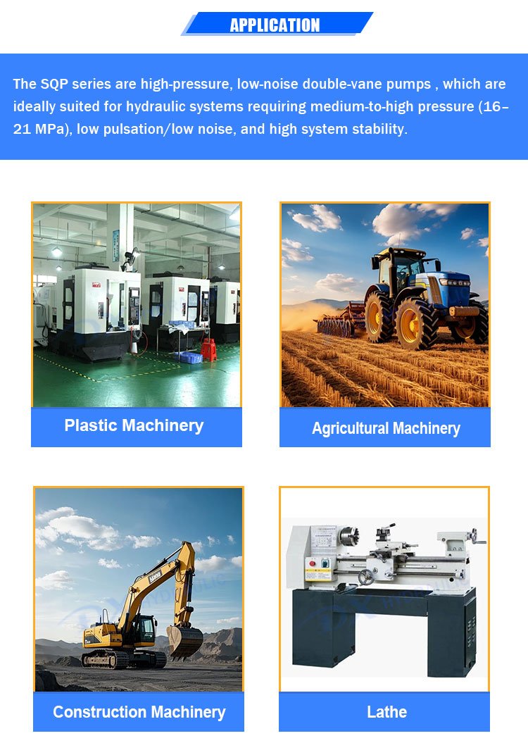 Серия SQP — это малошумные двухлопастные насосы высокого давления, которые идеально подходят для гидравлических систем, требующих среднего и высокого давления (16–21 МПа), низкой пульсации/низкого шума и высокой стабильности системы.